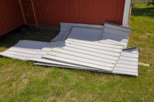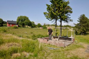 Die Blecheinfassung des Aussensitzplatzes vor dem Sommerhaus Strandgård >> war als Wind- und Sichtschutz gedacht, führte aber zu einem unangenehm heissen Klima im Innern. Wir möchten es offener haben, wollen aber das bestehende Betonfundament weiter verwenden. Miikka montiert die Trennscheibe auf dem Winkelschleifer und fräst die einbetonierten Blechständer durch.