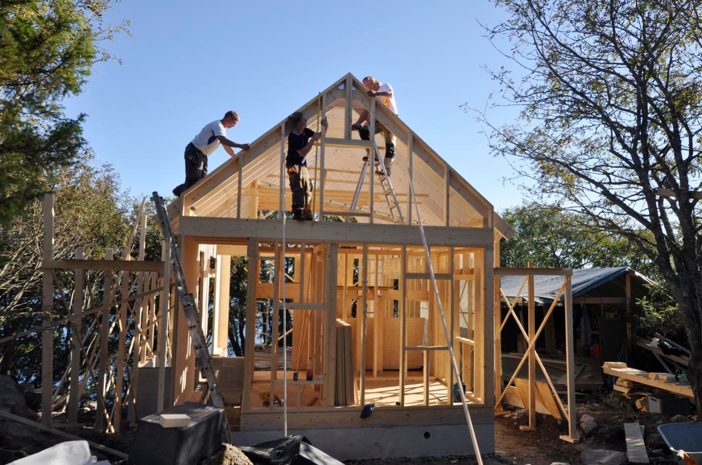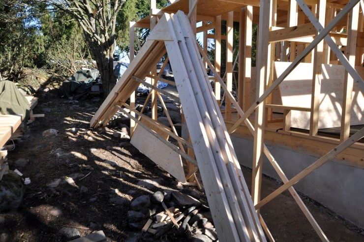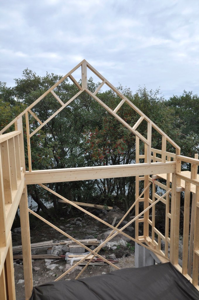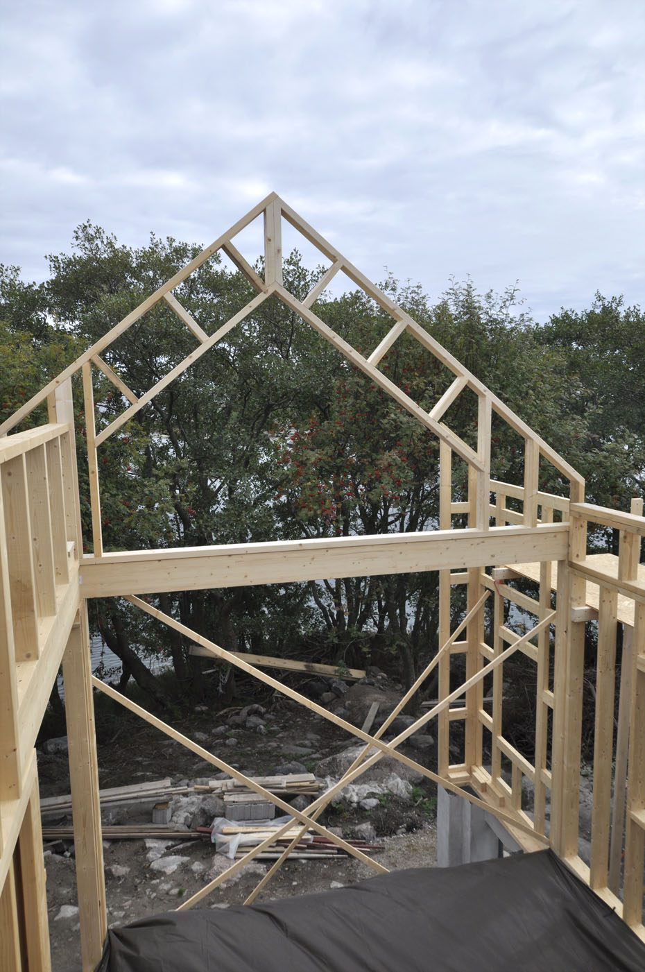 Nachdem Christoph, Teuvo und Mika die Rippenkonstruktion des Erdgeschosses errichtet haben, machen sie sich nun an die Giebelfelder und den Kniestock (das Stück Wand oberhalb des Zwischenbodens).