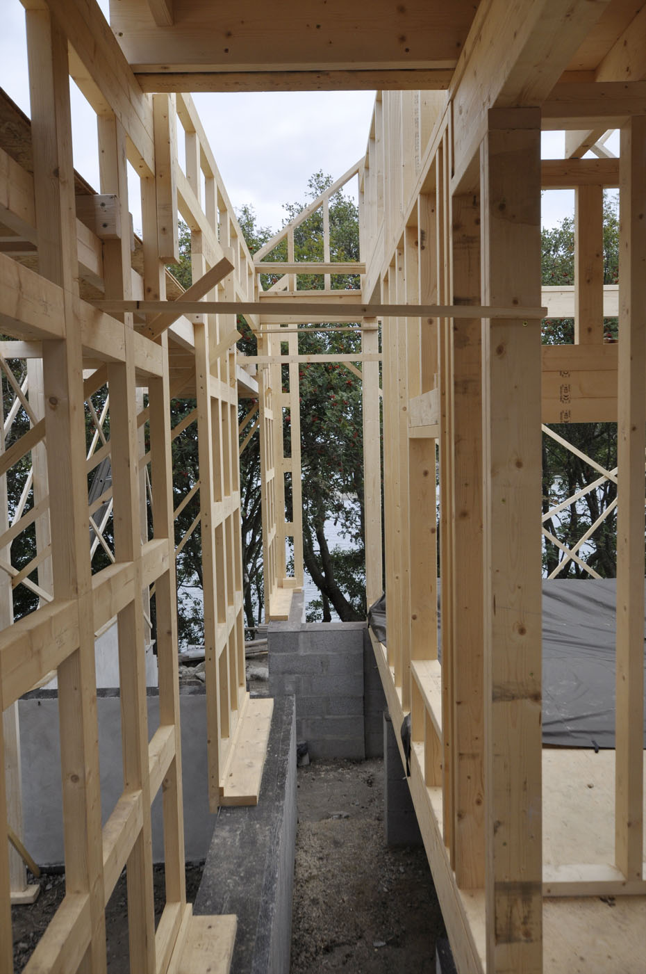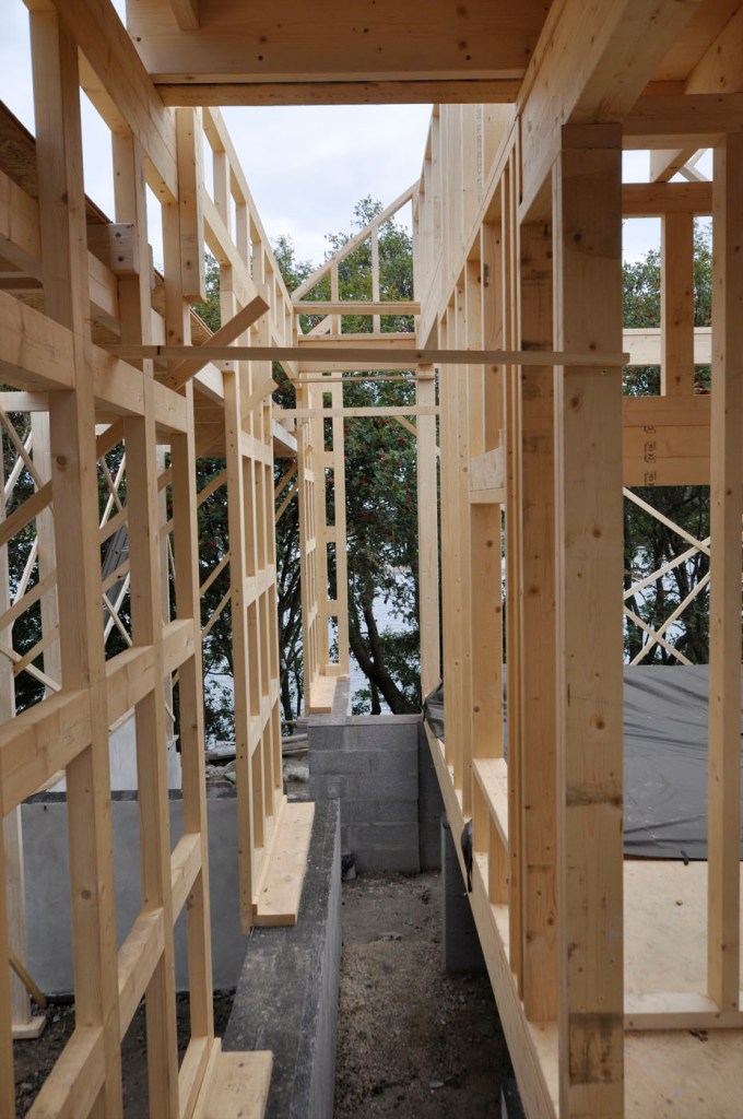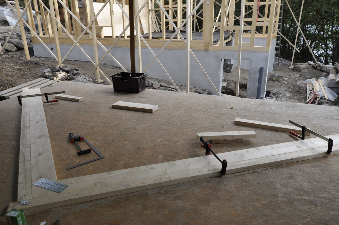 Nachdem Christoph, Teuvo und Mika die Rippenkonstruktion des Erdgeschosses errichtet haben, machen sie sich nun an die Giebelfelder und den Kniestock (das Stück Wand oberhalb des Zwischenbodens).