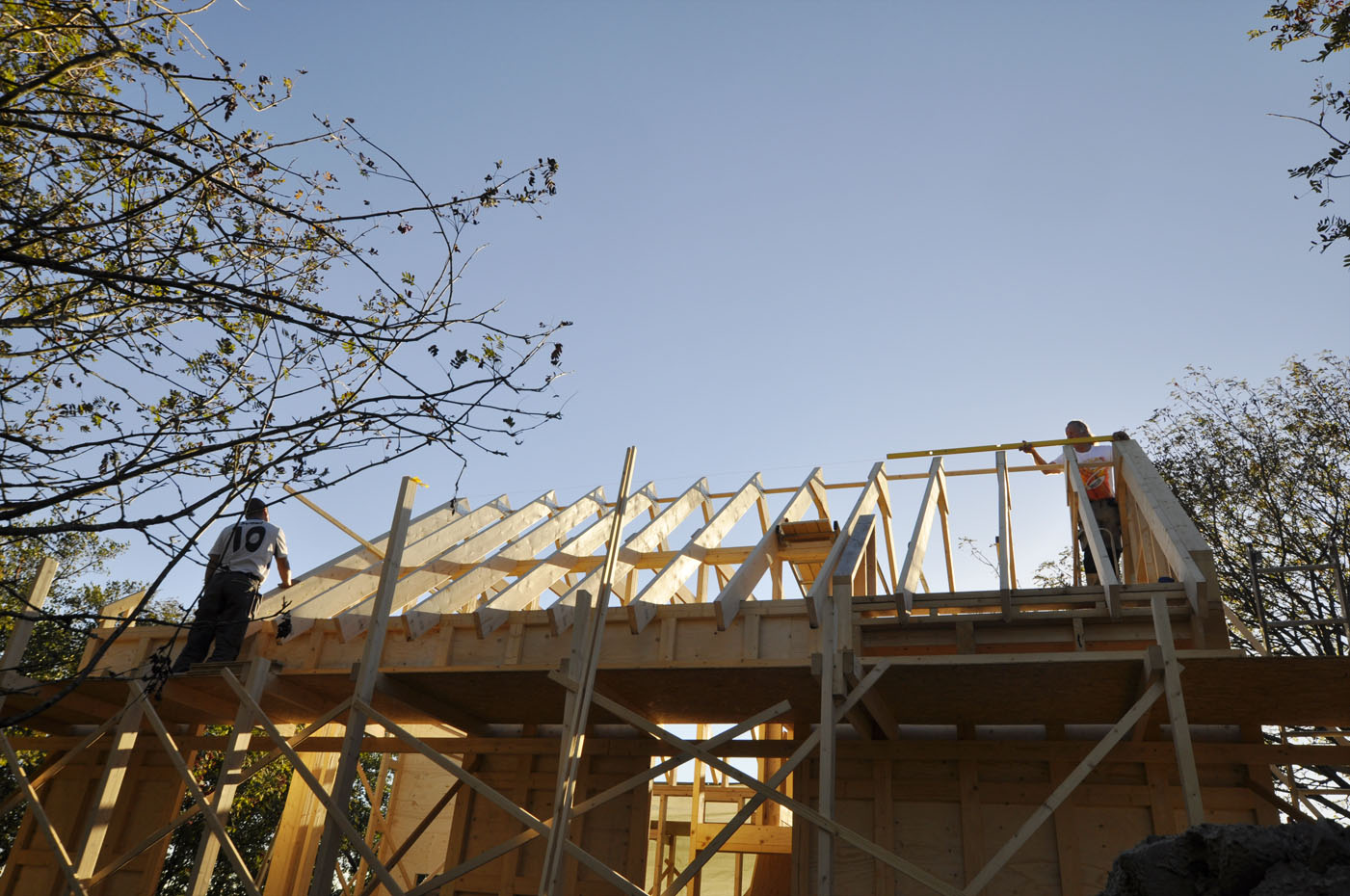 Gemeinsam werden die Sparrenpaare nach oben befördert, ausgerichtet und montiert.
