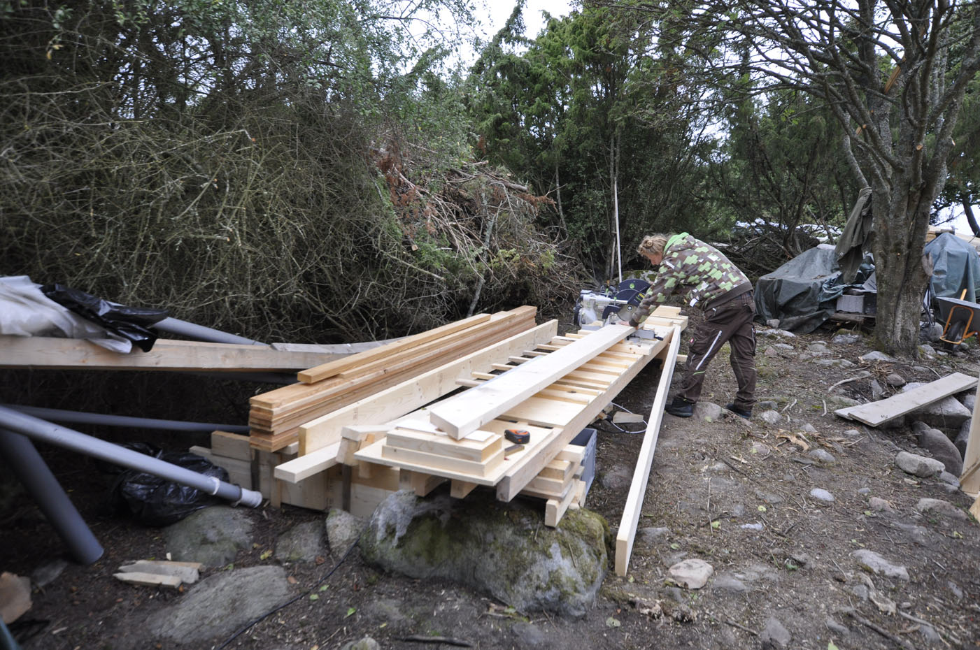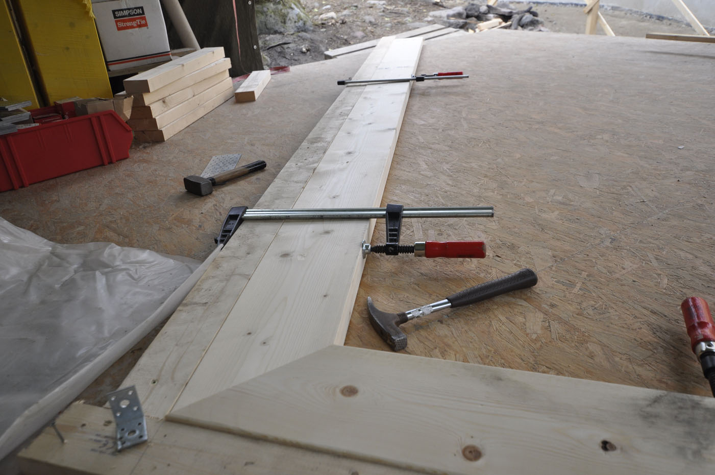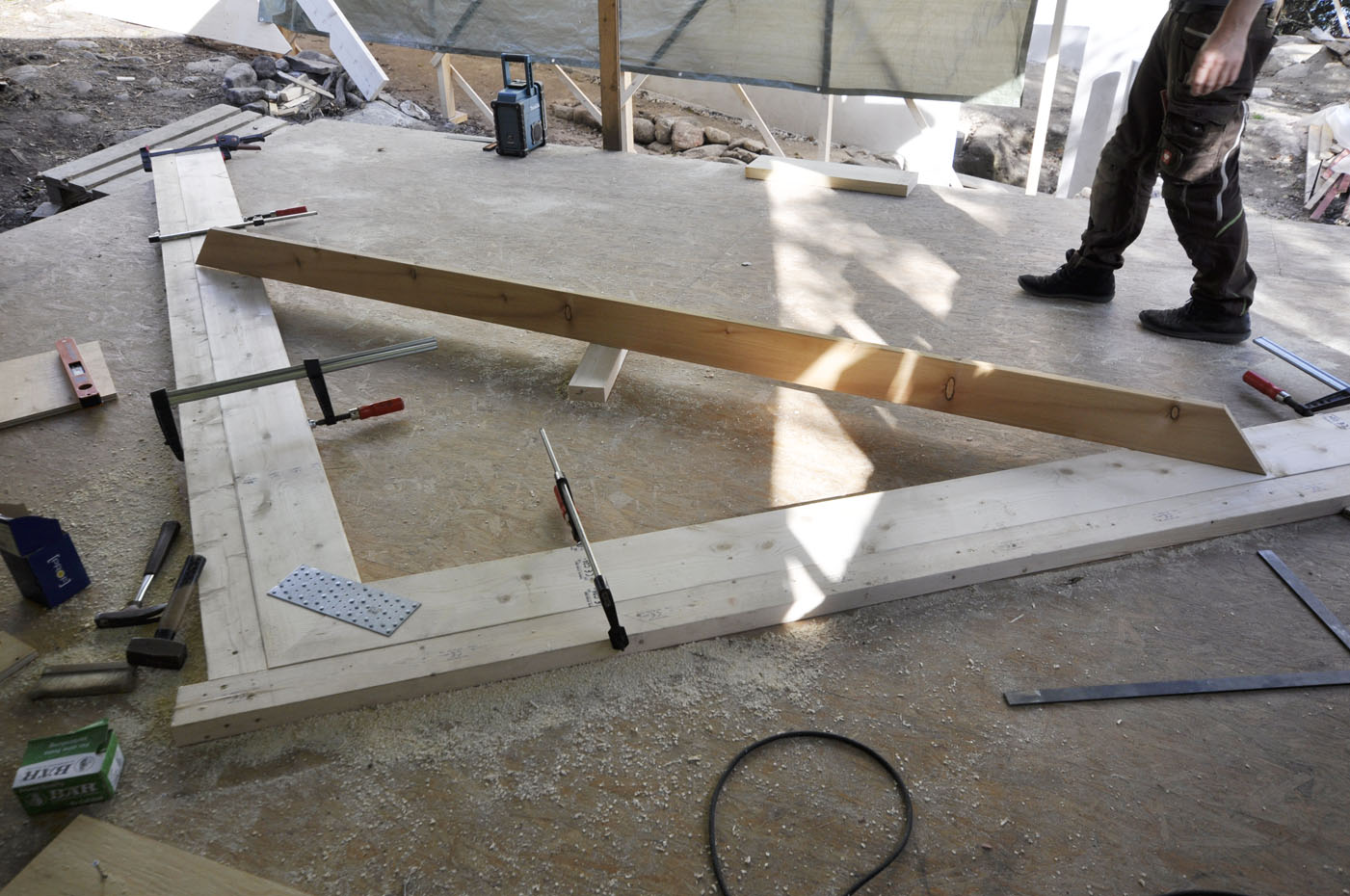 Für die Konstruktion der Giebelfelder schraubt Christoph zwei Kanthölzer im richtigen Winkel zueinander auf der Plattform seiner Aussenwerkstatt fest. Die Kanthölzer dienen als Anschlag bei der Montage der Giebelfelder. Im Giebelfeld Richtung Norden soll es ein kleines Fenster geben, in jenem zum Meer hin eine grosses Giebelfenster.