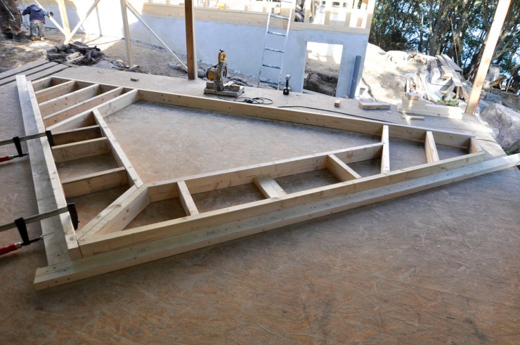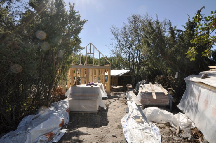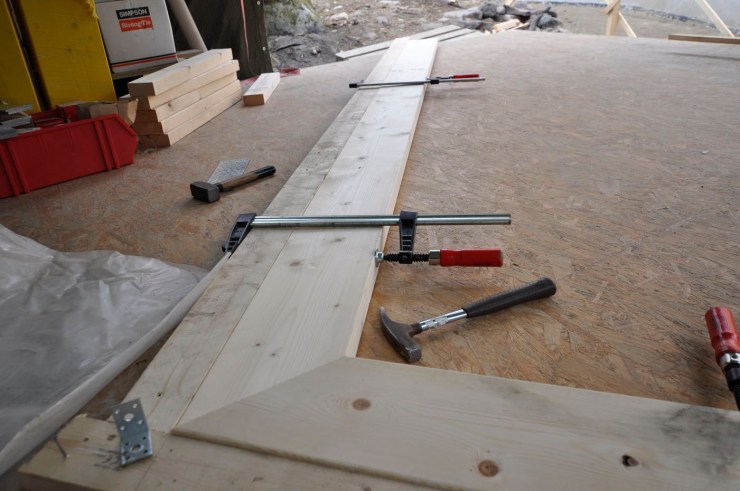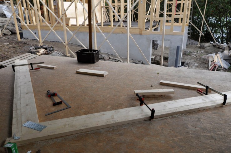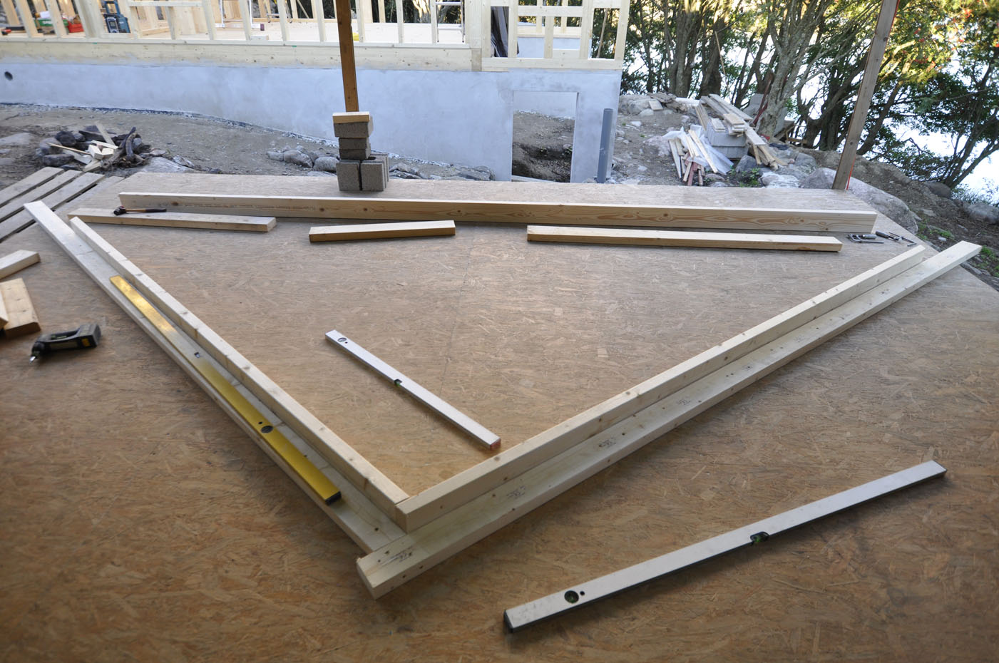 Für die Konstruktion der Giebelfelder schraubt Christoph zwei Kanthölzer im richtigen Winkel zueinander auf der Plattform seiner Aussenwerkstatt fest. Die Kanthölzer dienen als Anschlag bei der Montage der Giebelfelder. Im Giebelfeld Richtung Norden soll es ein kleines Fenster geben, in jenem zum Meer hin eine grosses Giebelfenster.