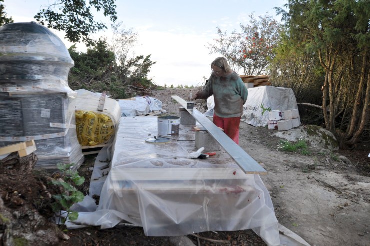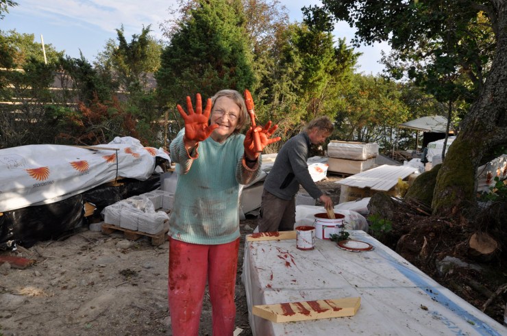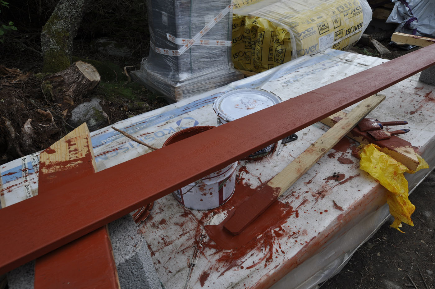 Vor der Montage streicht Imma alle Fassadenbretter. Mit Holzschutzgrundierung, dann mit grauer Lasur oder roter Leinölfarbe sowie weisser Ölfarbe für die Fenstereinfassungen und Eckbretter.