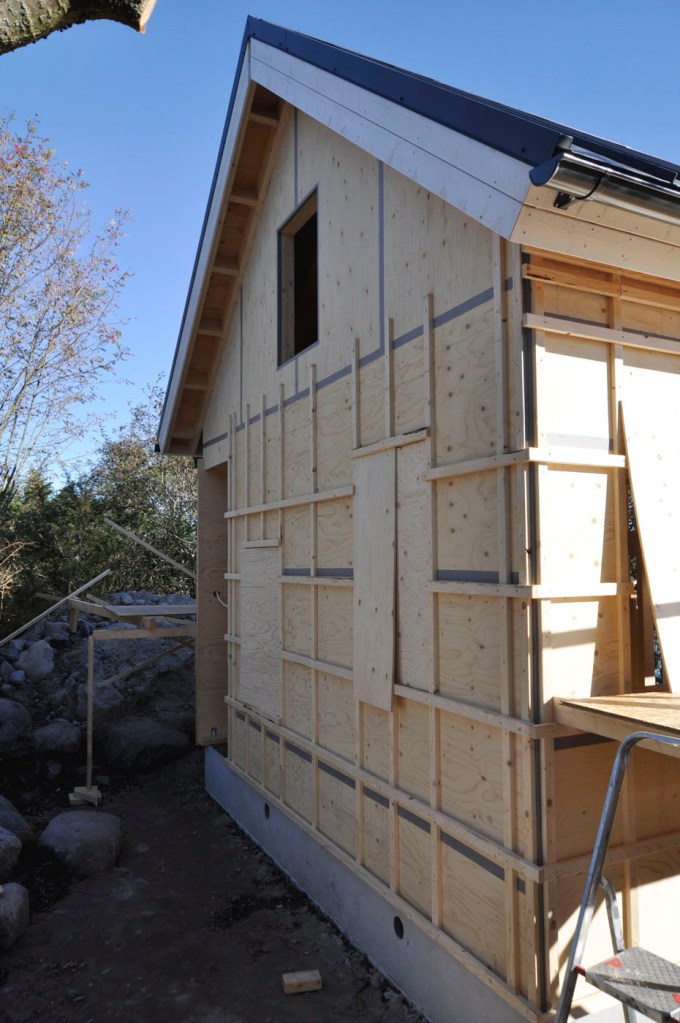 Auf die äussere Beplankung aus Sperrholzplatten wird die vertikale Konterlattung montiert. Und darüber dann horizontal und mit regelmässigem Abstand die Lattung, welche die Fassadenbretter trägt. Konterlattung und Lattung bilden eine Hinterlüftungsschicht zwischen eigentlicher Aussenwand und Fassadenschalung.