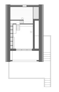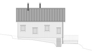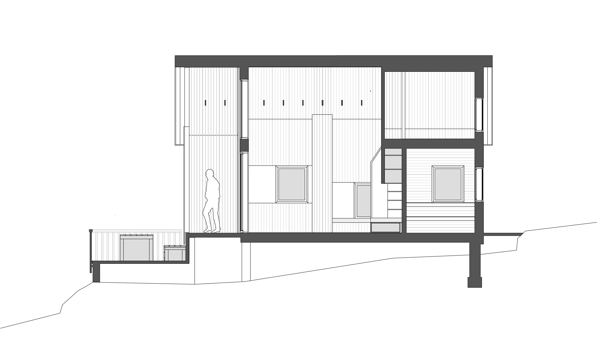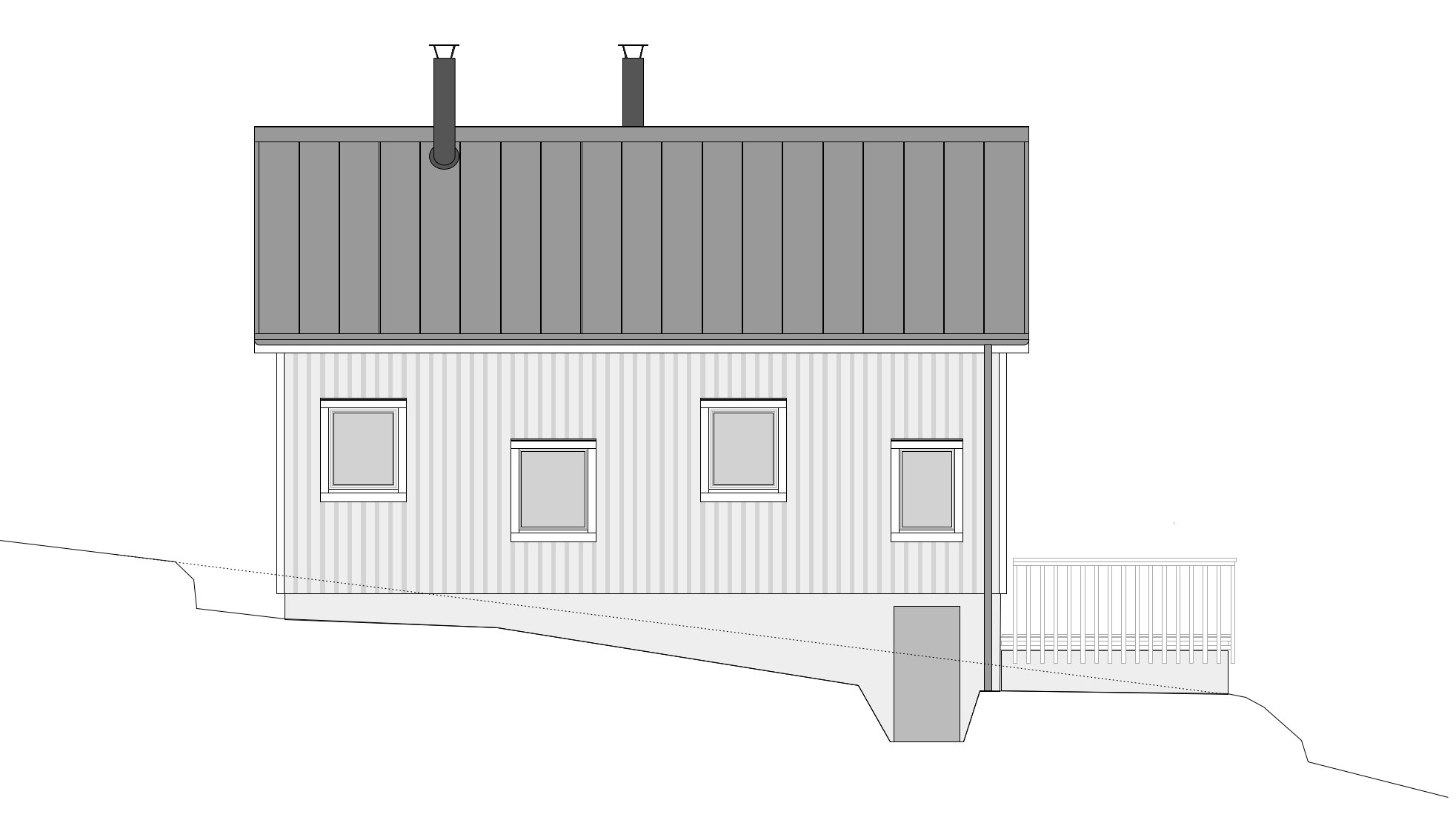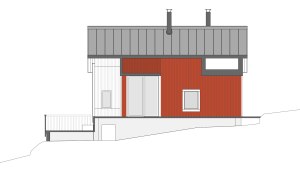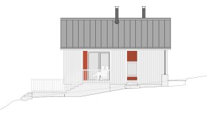 Die Reduktion auf einen kleinen Innenraum lässt den eigentlichen Hauptakteur – die umgebende Landschaft – umso stärker wirken. Während die kleinen Fensteröffnungen auf der Nord- und Ostseite einen Ausschnitt der Landschaft unmittelbar zeigen, öffnet sich die Südostecke mit grossen Festverglasungen und Fenstertüren auf einen Zwischenraum zwischen innen und aussen. Ein gedeckter Aussengang verbindet Sauna und Stube und führt auf eine kleine Terrasse gegen Osten. Die gedeckte Veranda gegen Süden und Meer wird weitergeführt in einer etwas tiefer gelegenen offenen Terrasse. Gedeckter Aussenraum und Veranda sind in die Grossform des Hauses eingebunden. Die Mehrschichtigkeit der Aussenhülle wird durch die Farbgebung betont: Die äussere Hülle fügt sich mit hellem Grau in die Granitfelsen ein. Durch die Öffnungen leuchtet die „innere“ Fassade in traditionellem Rot.