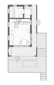 Die beheizbare Fläche des kleinen Hauses liegt inklusive Wände bei knapp 28m2 Grundfläche, was gerade noch im Toleranzbereich von nach Vorschrift 25m2 liegt. Grössere Gebäude dürfen nicht so nahe am Wasser gebaut werden. Ein Drittel der Grundfläche wird von der Sauna mit Vorraum eingenommen, der übrige, gut 15m2 grosse und bis zu 4.75m hohe Innenraum ist eine „Stube“, traditionellerweise ein multifunktionaler Raum. In Lintukoto wird in der Stube gekocht, gegessen, verweilt, geschlafen. Um den vorhandenen Raum bestmöglich auszunutzen, formt sich aus den geschlossenen Raumseiten gegen Westen und Norden ein Schlaf-/Aufbewahrungs-/Kochmöbel. Zusätzlichen Platz bietet der Parvi, der Schlupf über der Sauna.